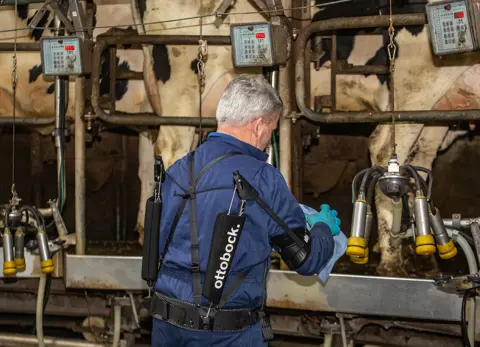 “Het exoskelet heb ik in april aangeschaft omdat ik een paar keer geblesseerd ben geweest aan mijn ellebogen. Ik had eerst een tennisarm en later een golfarm. Beide sporten beoefen ik overigens niet; deze blessures heb ik door het melken opgelopen. Dankzij het skelet is het melken minder belastend voor mijn bovenlichaam. Een nadeel is wel dat je soms ergens achter blijft haken en je wat dieper moet bukken als je ergens onderdoor wil. Daarnaast zijn door de riempjes diverse zakken in de overall moeilijker toegankelijk.